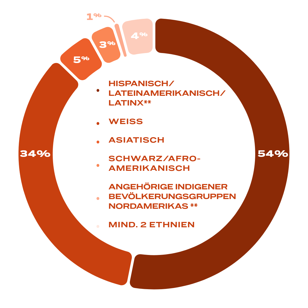 *Basierend auf dem EEO-1-Formular, einer Datenerhebung, die von der Equal Employment Opportunity Commission von allen Arbeitgeber:innen mit mehr als 100 Beschäftigten verlangt wird. Wir stellen diese vorläufigen Daten hier vor, um die ethnische Zugehörigkeit unserer Mitarbeiter:innen transparent zu machen. Derzeit sind die Daten, die wir gesammelt haben, begrenzter, als wir es uns wünschen. Dr. Bronner's ist bestrebt, die Sprache, die wir verwenden, und den Ansatz, den wir bei der Umsetzung fortschrittlicher Best Practices im Zusammenhang mit der Förderung von sozialer Gerechtigkeit, Vielfalt, Gleichberechtigung und Inklusion in unserem Unternehmen verfolgen, kontinuierlich zu verbessern und weiterzuentwickeln, sowohl im Allgemeinen als auch in Bezug auf diese Daten. Wir beabsichtigen, in künftigen Berichten mehr Informationen bereitzustellen. Das machen wir, sobald wir sicher sind, dass unsere Mitarbeiter:innen sich sicher und wohl dabei fühlen, Angaben zu so sensiblen Themen wie sexuelle Orientierung, Geschlecht, Behinderung und Veteranenstatus zu machen und wir mehr Kompetenz bei der Erfassung dieser Informationen entwickelt haben.