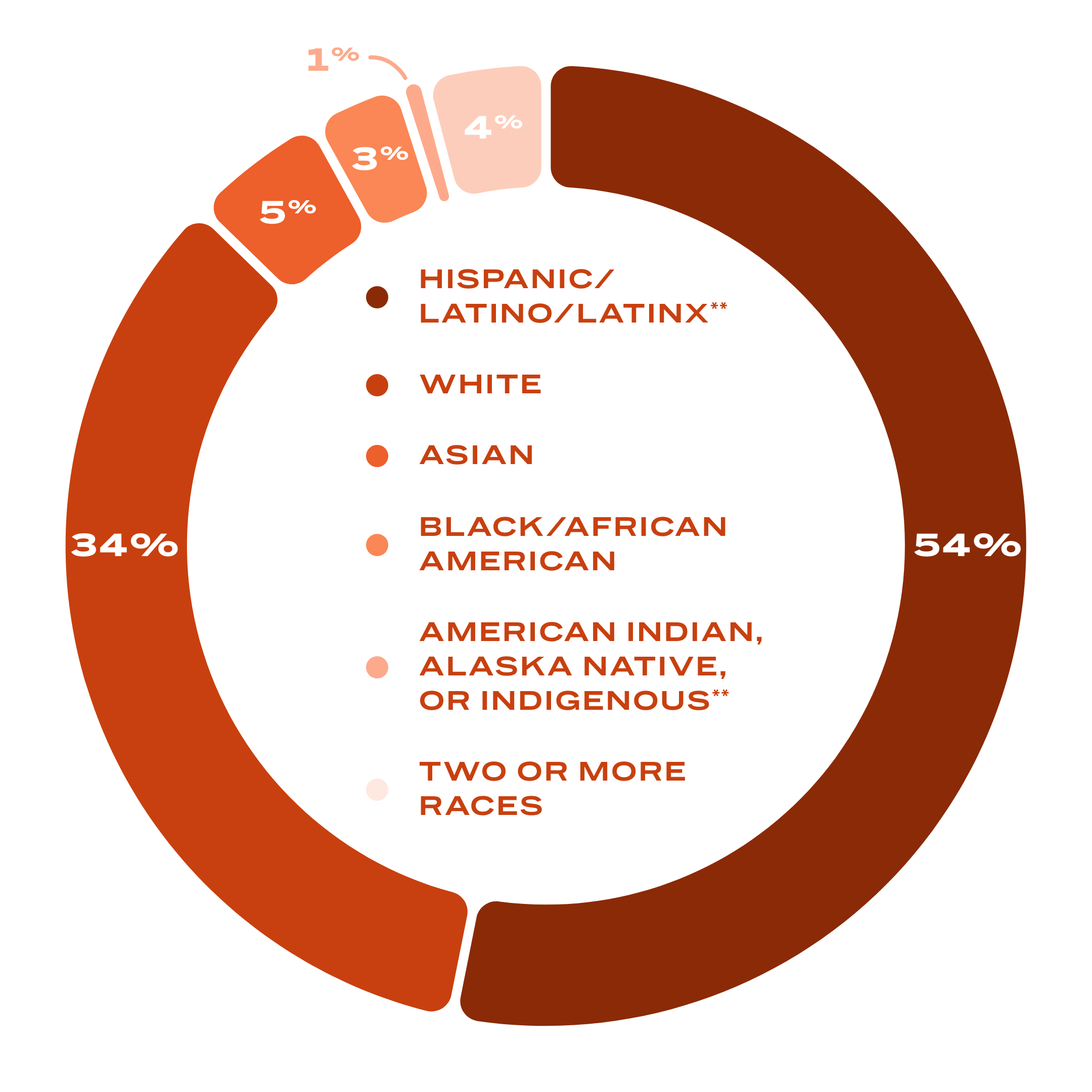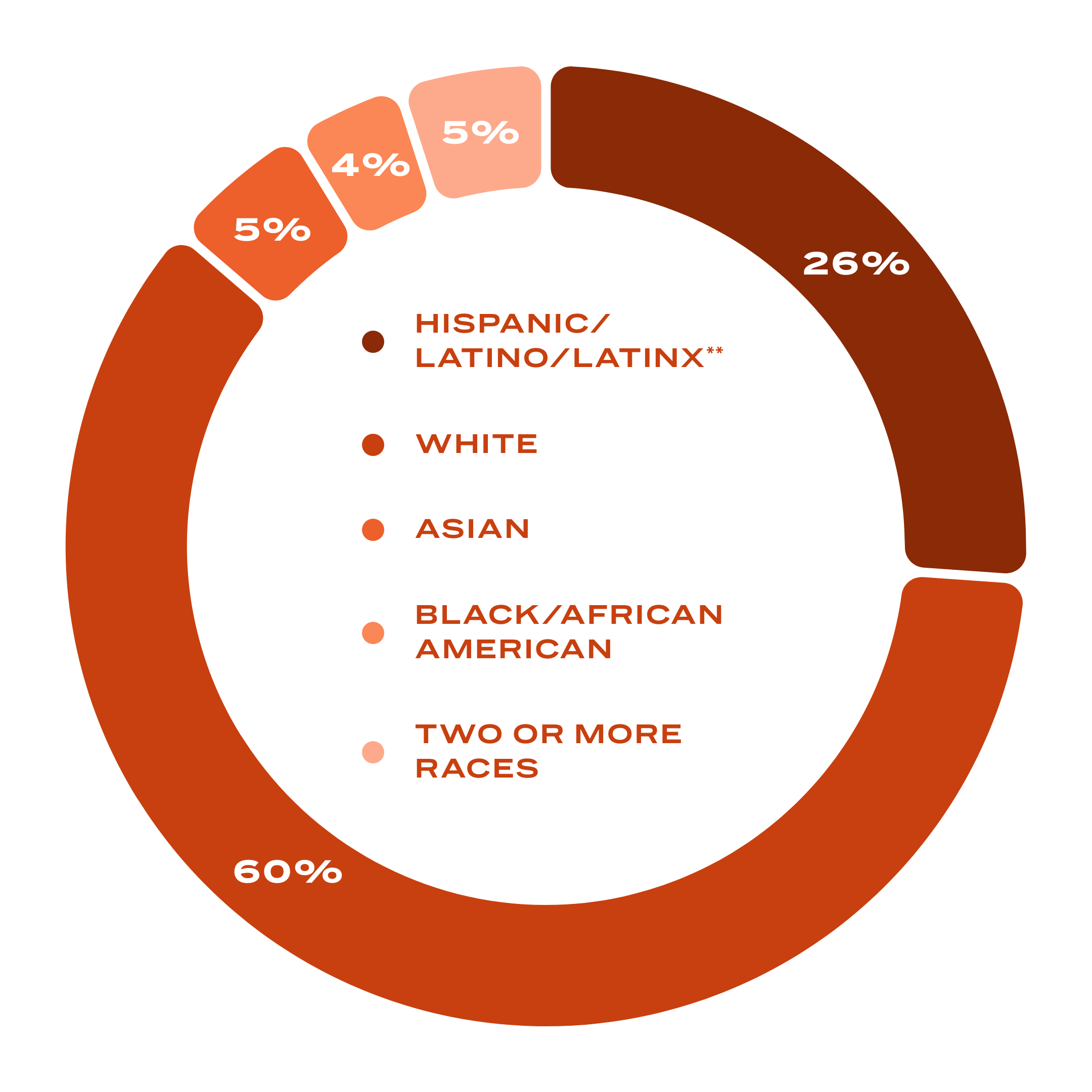 *Based on the EEO-1 form, data collection mandated by the Equal Employment Opportunity Commission from all employers with more than 100 employees. We present this data here as a work in progress, in the interest of being transparent about the racial and ethnic identities of our employees. Currently, what we have collected is more limited than we would like. Dr. Bronner's is committed to continuously improving and evolving the language we use and the approach we take in striving to implement progressive best practices related to fostering social justice, diversity, equity, and inclusion in our company, both in general and around this data. We aim to provide more information in future reports, as we become more confident that our employees feel safe and comfortable in their self-reporting and self-identification, especially around sexual orientation, gender, disability, and veteran status, and as we become more competent in collecting this information.